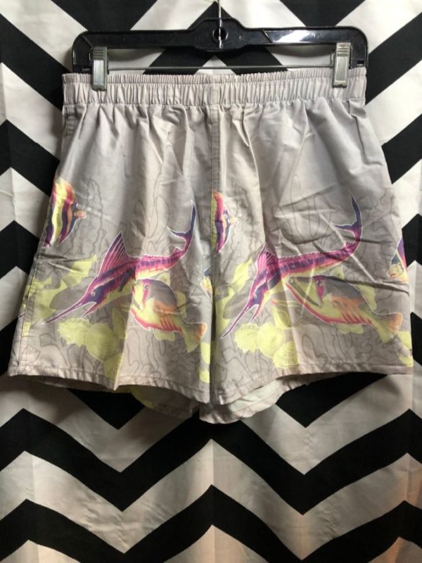 SWIM TRUNKS, COTTON, ELASTIC WAIST, SWORDFISH DESIGN, FRONT POCKETS, MULTI-COLOR, DEADSTOCK, GRAY/PURPLE/PINK/YELLOW/FUCHSIA, SIZE S