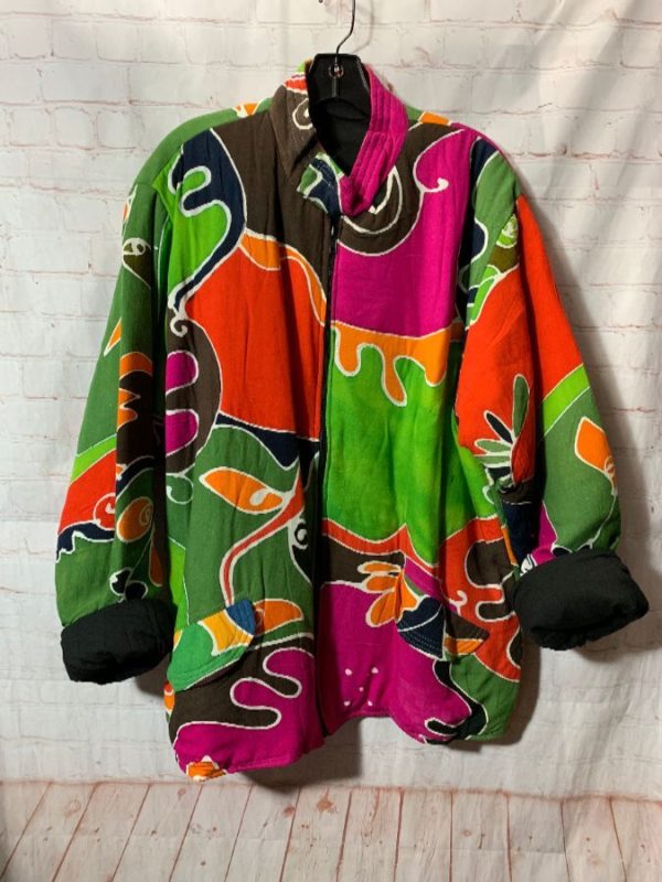 Puffy jacket, zip-up, solid color lining, bold abstract floral print, bright colors, neon colors, dead-stock, green/maroon/neon orange/black/white, size XL