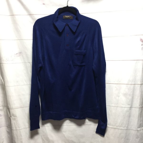 1970’S THANE SHIRT, PULLOVER, LONG SLEEVES, BUTTON-UP NECK, KNIT, COLLAR, LEFT FRONT POCKET, DEAD-STOCK, BLUE, SIZE L