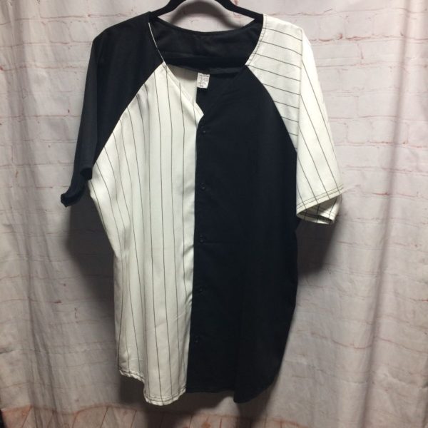 1990’s baseball jersey, cotton, short sleeves, button-up, solid & pinstriped print in half & half color-block design, dead-stock, black/white, size XL