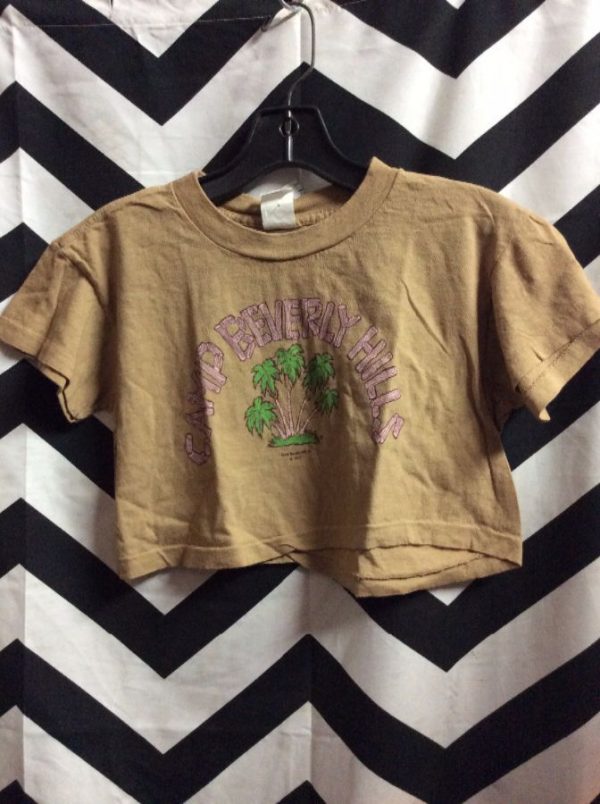 1990’S CAMP BEVERLY HILLS 1977 T-SHIRT, COTTON, CROP TOP, DEADSTOCK, TAN/PINK/GREEN, SIZE XS/S/M