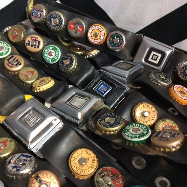 BELT – SEAT BELT BUCKLE – ADORNED W/BEER BOTTLE CAPS