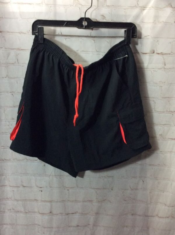 Woolrich shorts/swim trunks, elastic waist, high cut, neon colored trim, pockets, deadstock, black/orange, size adjustable
