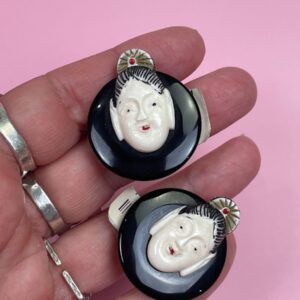 UNIQUE CLIP-ON EARRINGS GLASS DISC W/ CARVED ASIAN PORTRAIT
