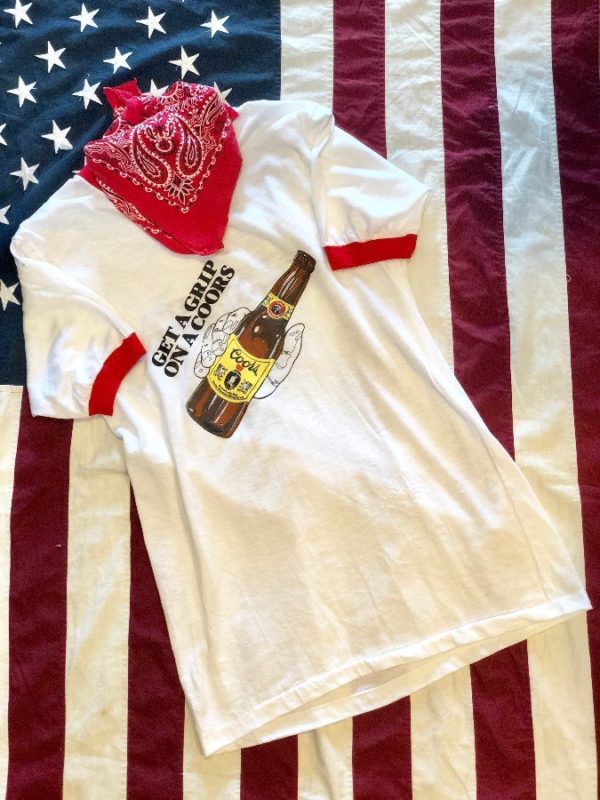 Coors T-shirt, ringer tee, screen printed Get A Grip On A Coors lettering with beer bottle front graphic, dead-stock, white/red/multi, size M. As is