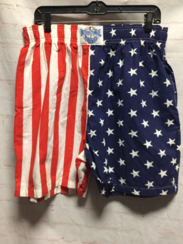 International Baggyz shorts, cotton, elastic waist, 50/50 American flag design one side vertical stripes, one side stars, dead-stock, red/blue/white, size L