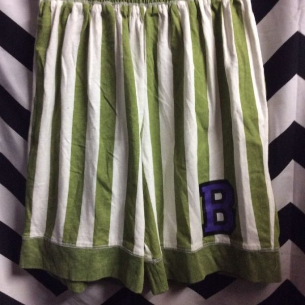Shorts, cotton, elastic waist, large back pocket, vertical stripe pattern, letter B on lower left leg, deadstock, green/white/purple, size S