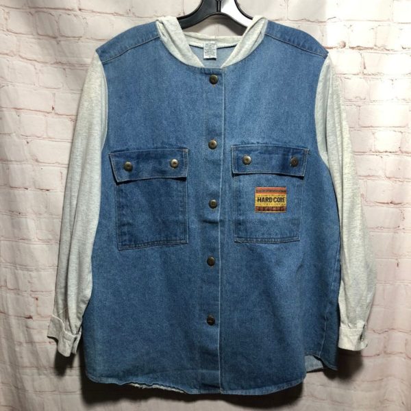 Hard Core denim jacket, cotton, button-up, hooded, sweatshirt sleeves & hood, 2 button-up front pockets, logo patch, deadstock, blue/gray, size XL
