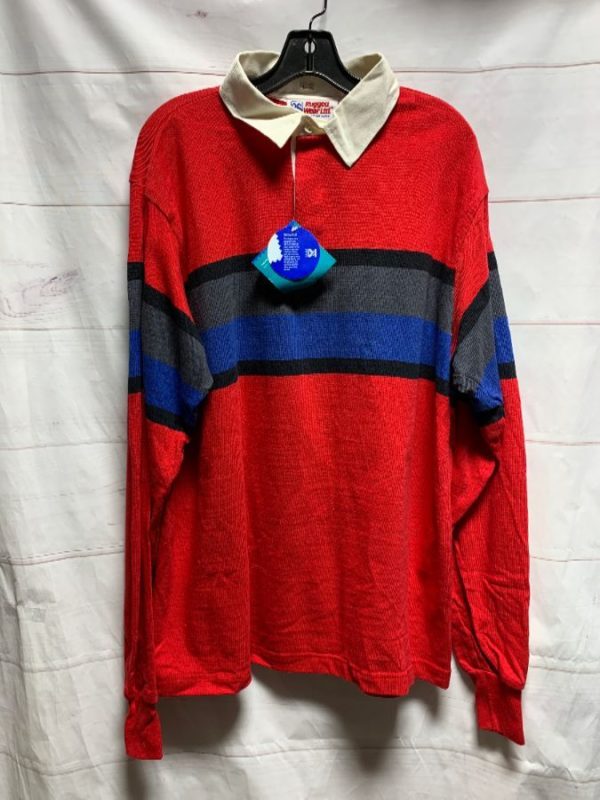 RUGGED WEAR LTD, RUGBY SHIRT, COTTON, KNIT, LONG SLEEVES, CONTRASTING COLLAR, HORIZONTAL STRIPES IN COLOR-BLOCK DESIGN, DEAD-STOCK, RED/GRAY/BLUE/WHITE/BLACK, SIZE XXL