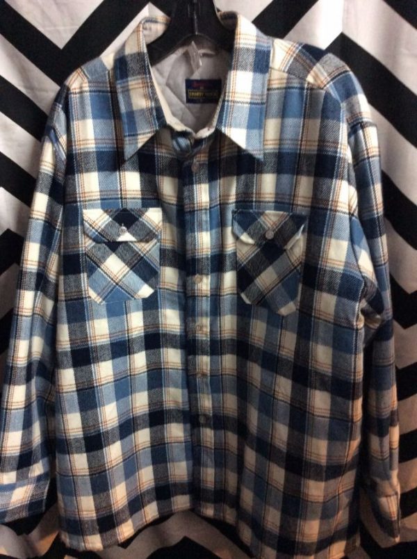 Flannel shirt, long sleeves, button-up, plaid design, quilted lining, deadstock, medium blue/white/tan/dark blue, size XL