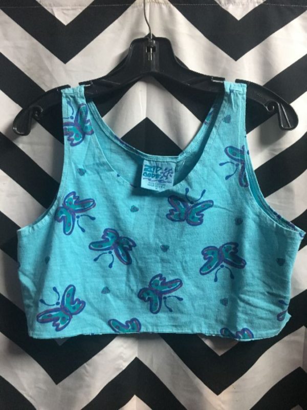 TANK TOP, COTTON, CROPPED, BUTTERFLY PRINT DESIGN, DEAD-STOCK, NWT, TURQ/DARK BLUE, SIZE S/M