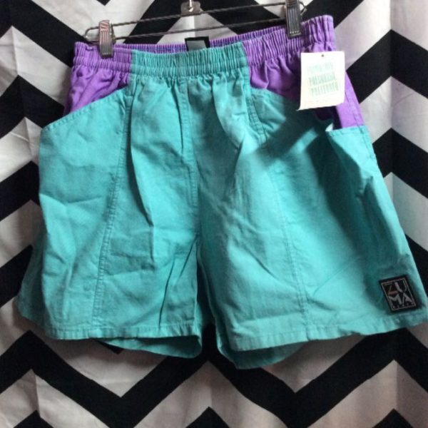 Swim trunks, cotton, color block design, deadstock, NWT, turq/purple, size L