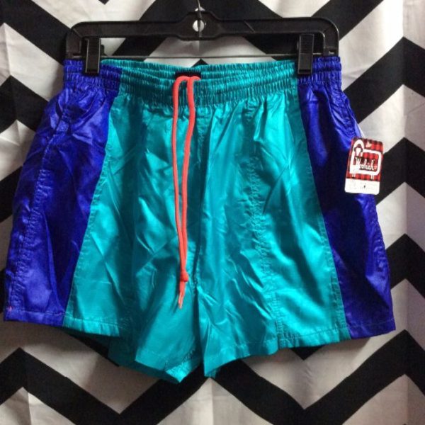 Swim trunks, solid neon color block design, elastic waist, deadstock, NWT, teal/purple/red/yellow, size M