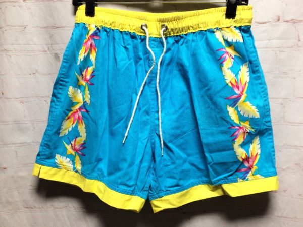 OCEAN BREEZE SWIM TRUNKS W/ ELASTIC WAIST & TROPICAL FLORAL PRINT VERTICAL STRIPE