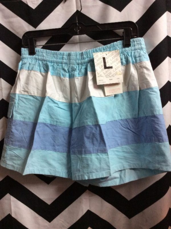Jantzen cotton swim trunks, pastel color block design, deadstock, light blue/white/medium blue, size L