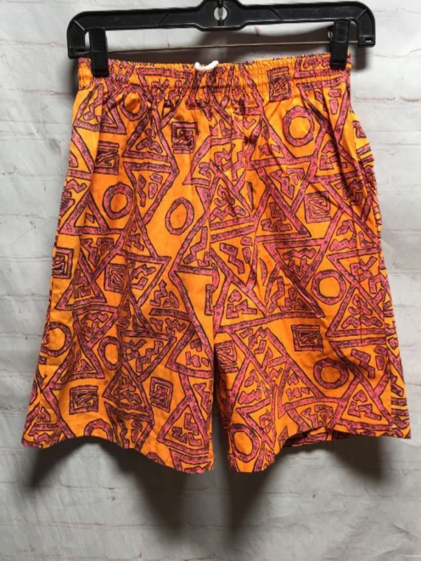 Rad 1980’s swim shorts, knee length, back pocket, abstract graphic print. orange/black/pink, size S