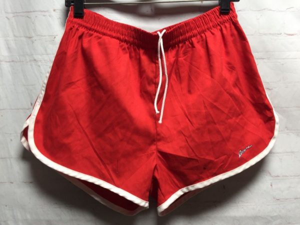 Retro 1980’s Ocean swim trunks, elastic waist with drawstring, contrasting trim on legs, screen printed logo, dead-stock, red/white, size L