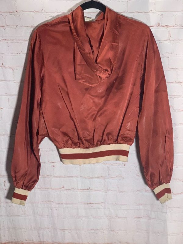 Citation bomber jacket, satin/acetate, zip-up, hooded, knit cuffs/hem, striped trim on cuffs & hem, dead-stock, rust/beige, size S As is