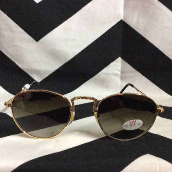 Designer sunglasses, semi-round gold wire frames, UV lenses, deadstock,gold/gray