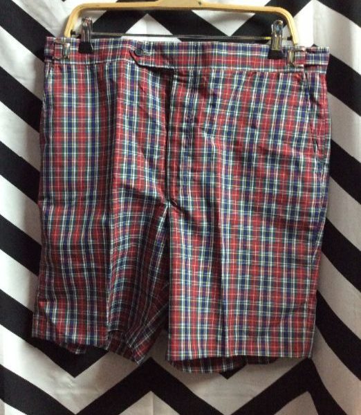 Shorts, zip-up, plaid design, deadstock, burgundy/blue, size 36W