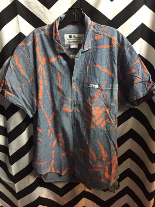 SHORT SLEEVE BUTTON-UP SHIRT W/1 FRONT POCKET & PAINTED LEAF PRINT ON FAKE DENIM