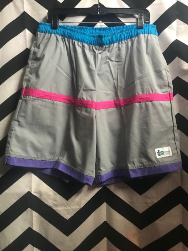 Beach Pounder swim trunks, four-color horizontal stripe design, dead-stock, blue/gray/pink/purple, size L