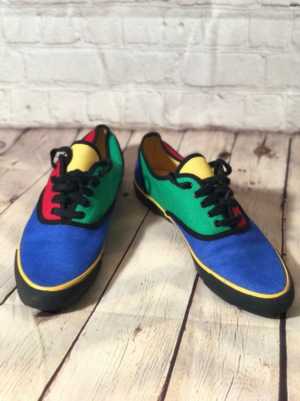 1980’S-1990’S TENNIS SHOES, LACE-UP, COLOR-BLOCK DESIGN WITH PRIMARY COLORS, DEAD-STOCK, BLUE/RED/GREEN/YELLOW/BLACK, SIZE 9