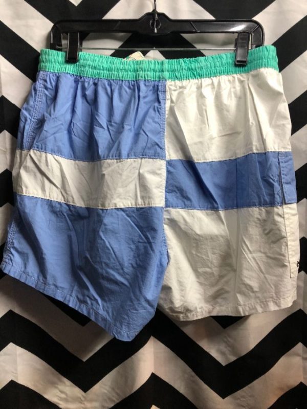 JANTZEN SPORT SWIM TRUNKS, ELASTIC WAIST, TRI-COLOR, COLOR BLOCK DESIGN, DEADSTOCK, NWT, WHITE/BLUE/AQUA, SIZE L