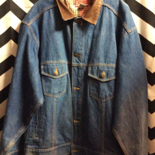 DENIM BUTTON-UP JACKET W/LEATHER COLLAR