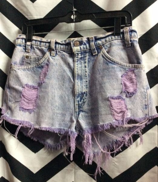 LEVIS DENIM SHORTS – CUTOFF – ZIP-FLY – PASTEL PURPLE RIPS & FRINGE