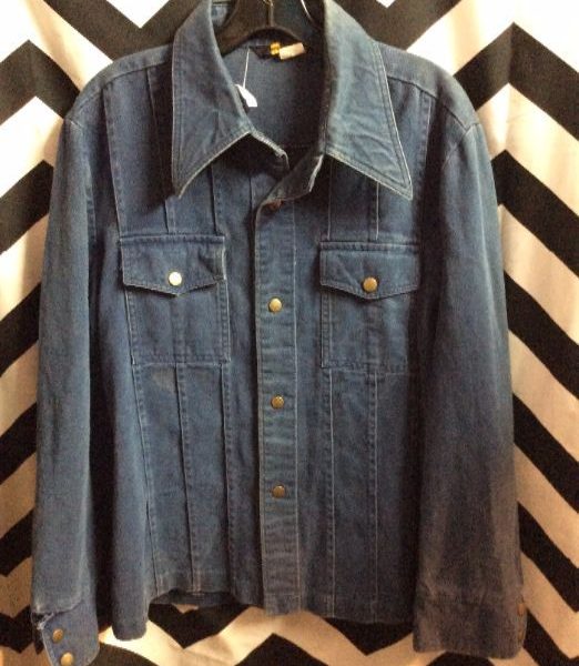 Denim jacket, long sleeve, button-up, front pockets, 3 vertical seamed pleats down front, blue