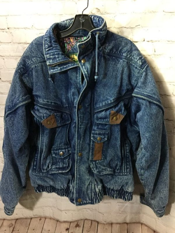 Eagles Ridge denim jacket, heavy duty, button-up, multiple front pockets, quilting across shoulders, bright print inside collar, acid washed, medium blue, size L