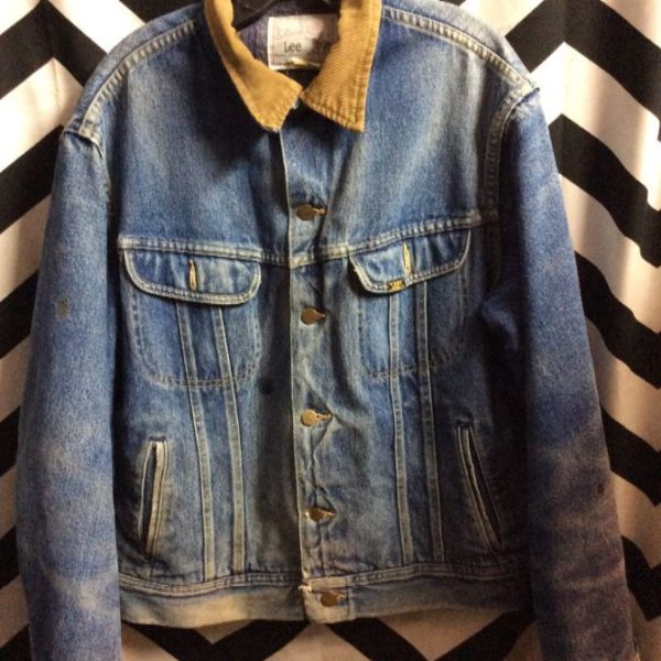 Lee denim Storm Rider jacket, button-up, black tag, corduroy collar, wool lining, 4 front pockets, medium blue/tan, size L stained as is