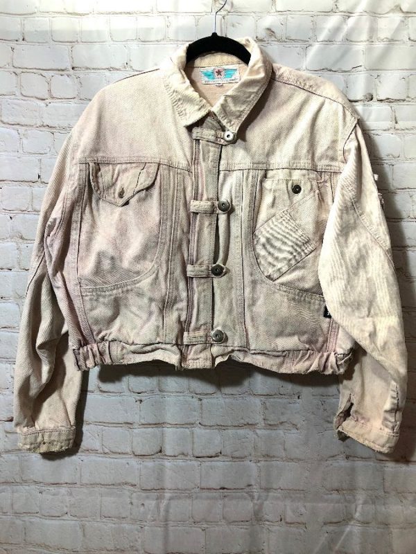 Izzi denim jacket, cropped, zip/button-up, multiple pockets & sleeves, light acid wash, pastel tint, light blue/light pink, size M as is