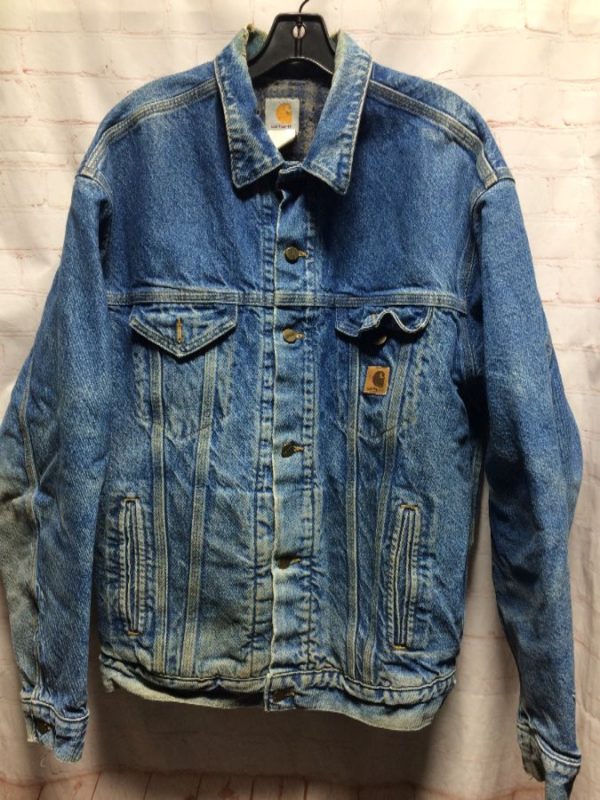 Carthartt denim jacket, cotton, button-up, plaid flannel lining, 2 button-up pockets, 4 front pockets, button-up cuffs, distressed collar & sleeves, blue/black As is