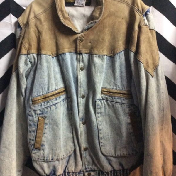 DENIM JACKET W/LEATHER PANELS ZIPPERED POCKETS & CINCHED WAIST