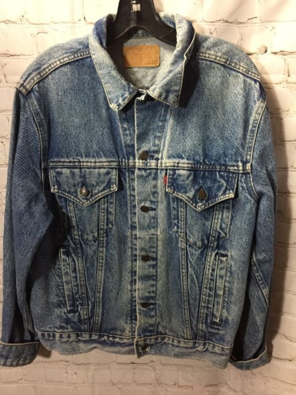 Classic style Levis denim jacket, button-up, red tab, front pockets, acid washed, medium blue, size S