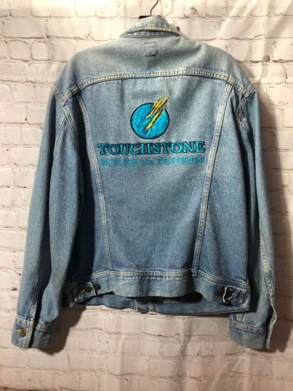 Lee denim jacket, cotton, button-up, 4 front pockets, embroidered Touchstone Pictures & Television with circle & lightning back design, acid wash, medium-blue/turq/yellow, size M