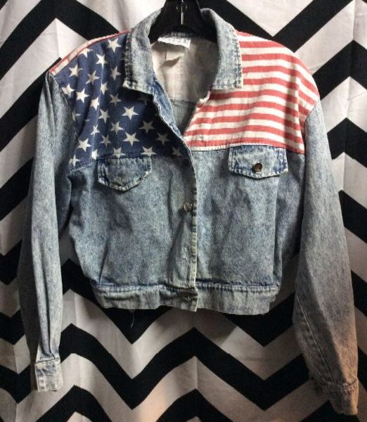 DENIM JACKET – CROPPED – AMERICAN FLAG DESIGN ON SHOULDERS – ACID WASHED