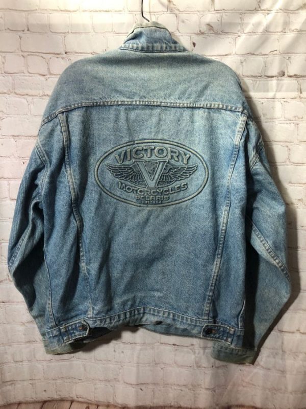 SKU: Z9R7EF Category: Denim Jackets Tags: button-up, cotton, denim, embossed back design, left chest logo, made in USA, motorcycles, oval outline, V with wings, Victory Motorcycles