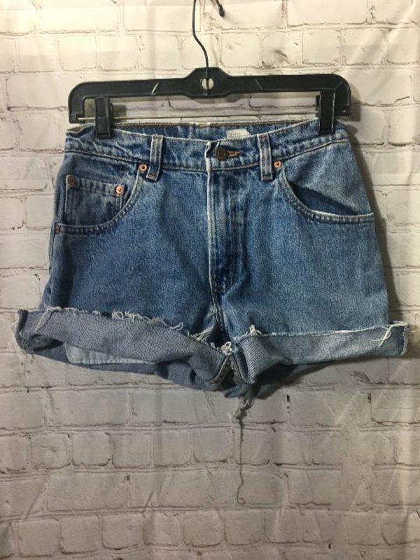 Levis denim shorts, cut-off, high waist, red tab, acid washed, medium blue, size 28″ W