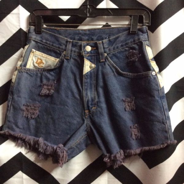 DENIM SHORTS – TRIANGLE PATCH APPLIQUES’ – FRAYED