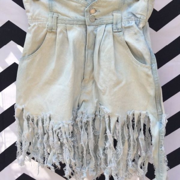 DENIM SKORT/SHORTS, BLEACHED, PAPER BAG WAIST & LONG FRINGE HEM, ADDED DECORATIVE SAILING PATCH ON BACK