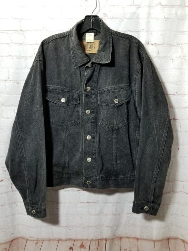 Saugatuck Dry Goods denim jacket, trucker style, cotton, front pockets, faded, black, size M