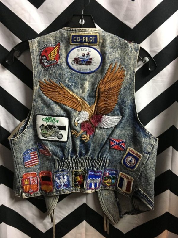 Denim vest, tie front, large embroidered eagle patch, covered with multiple embroidered small patches, leopard print & fringe, acid washed denim, medium blue/multi, size S