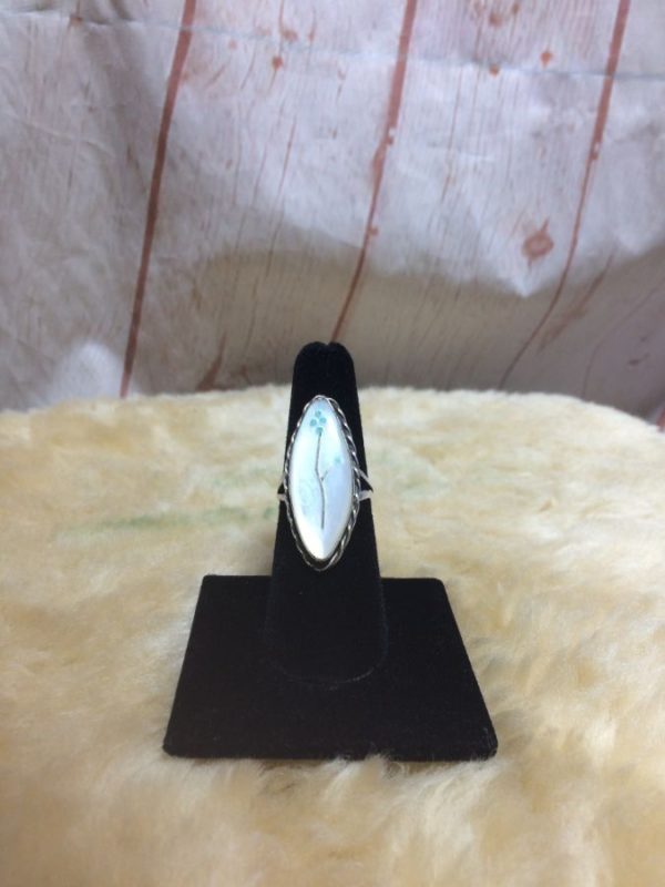 OVAL SHAPED OPAL RING W/ FLOWER DESIGN & SILVER METAL MOUNTING