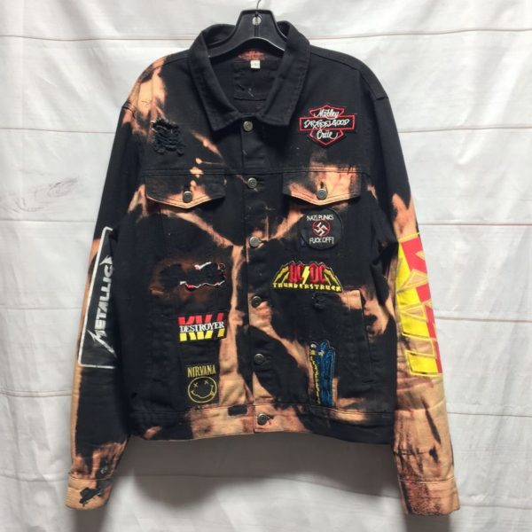 DISTRESSED & FULLY PATCHED & BAND PRINTED BLEACHED OUT BLACK DENIM JACKET SIDE ZIPPERS