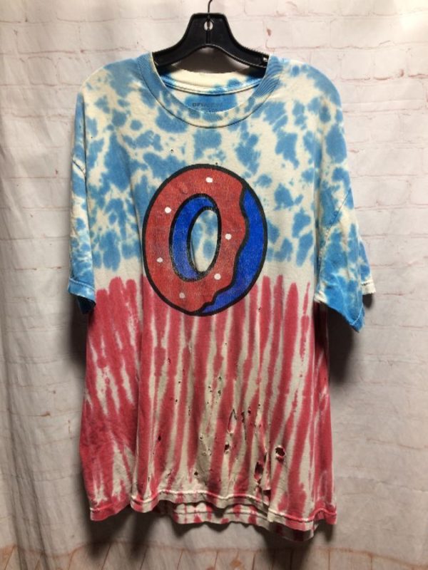 Odd Future T-shirt, cotton, tie-dyed, OFWGKTA, screen printed two toned front doughnut logo, vertical lines on lower half, distressed, red/white/blue, size XL