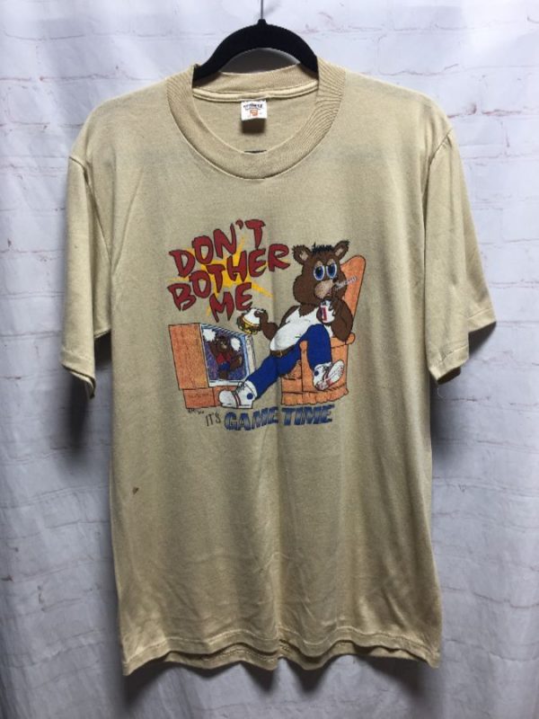 Sunbelt Sportswear T-shirt, Don’t Bother Me, It’s Game Time, screen printed couch potato beer drinking bear with lettering, beige/red/brown/blue/white/tan, size XL