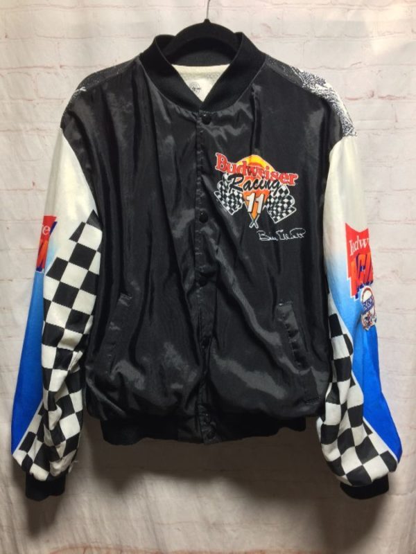 OFFICIAL PRODUCT BUDWEISER RACING BOMBER JACKET, SNAP-UP, KNIT COLLAR/CUFFS/HEM, ANHEUSER BUSCH BAVARIAN BEER, KING OF BEER, BILL ELLIOT #11, SCREEN PRINTED SLEEVES & FULL BACK DESIGNS, EMBROIDERED PATCH, DOPE, BLACK/WHITE/ORANGE/BLUE/YELLOW/WHITE, SIZE L AS IS
